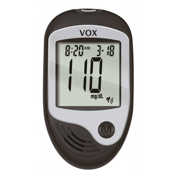 Le glucomètre électronique parlant Vox guide le patient étape par étape avec des phrases claires et simples prononcées par une voix humaine.